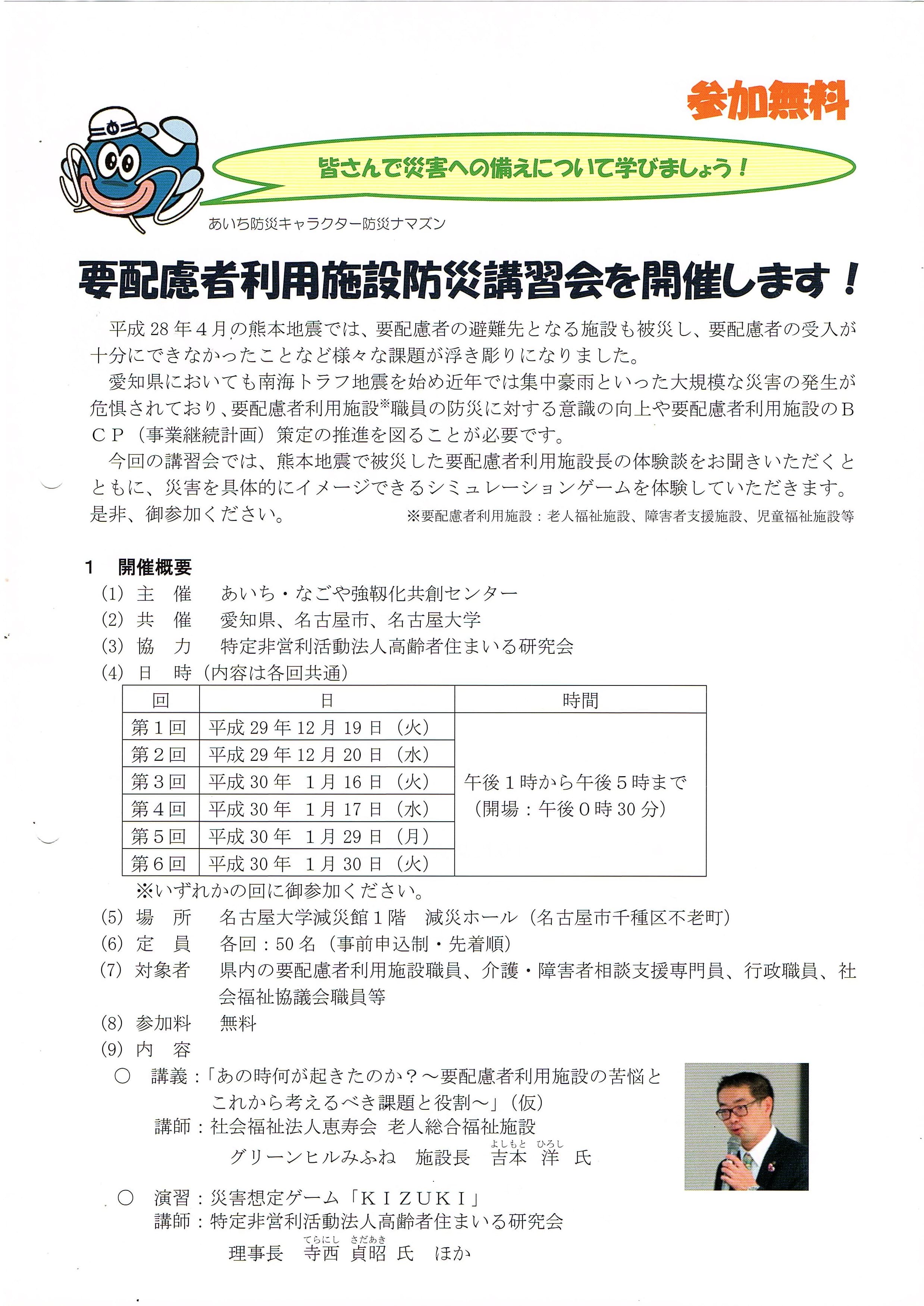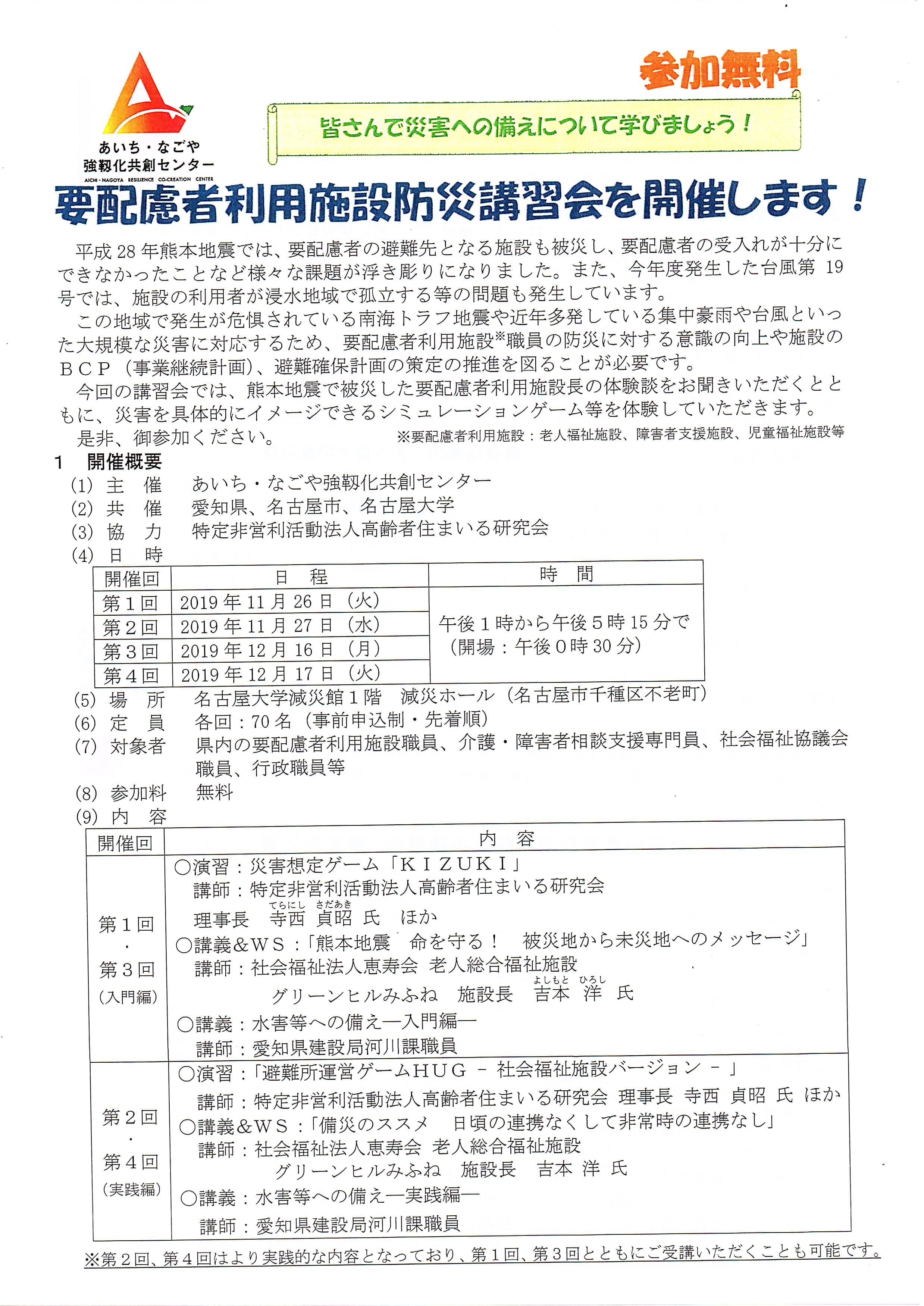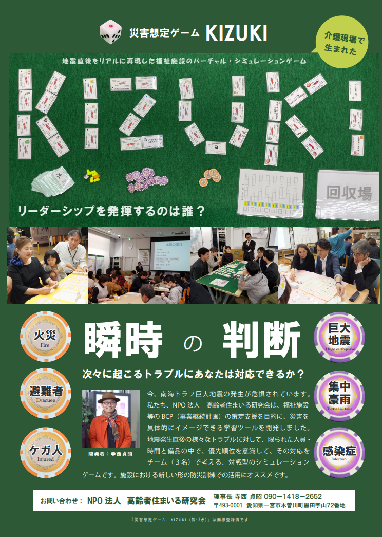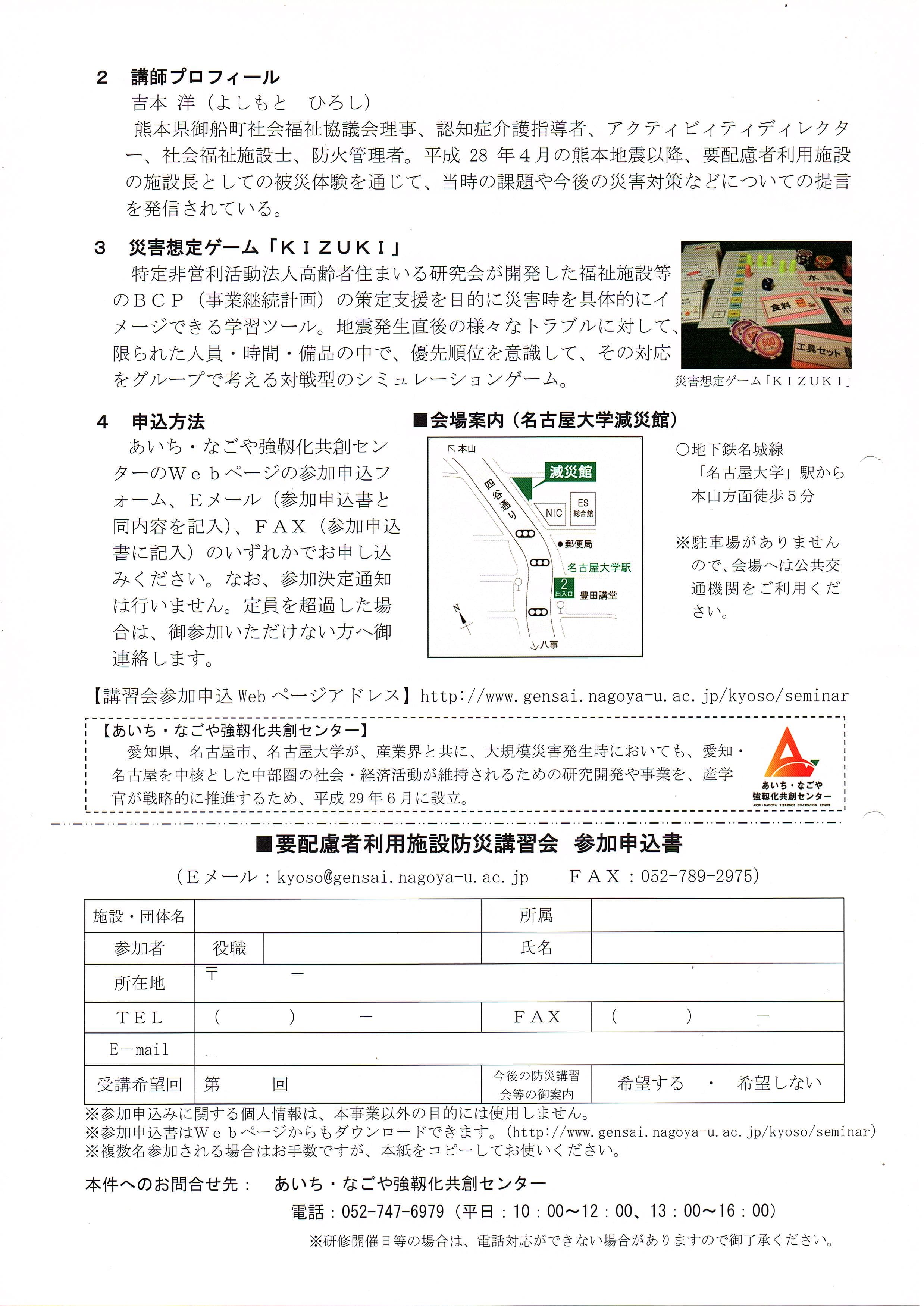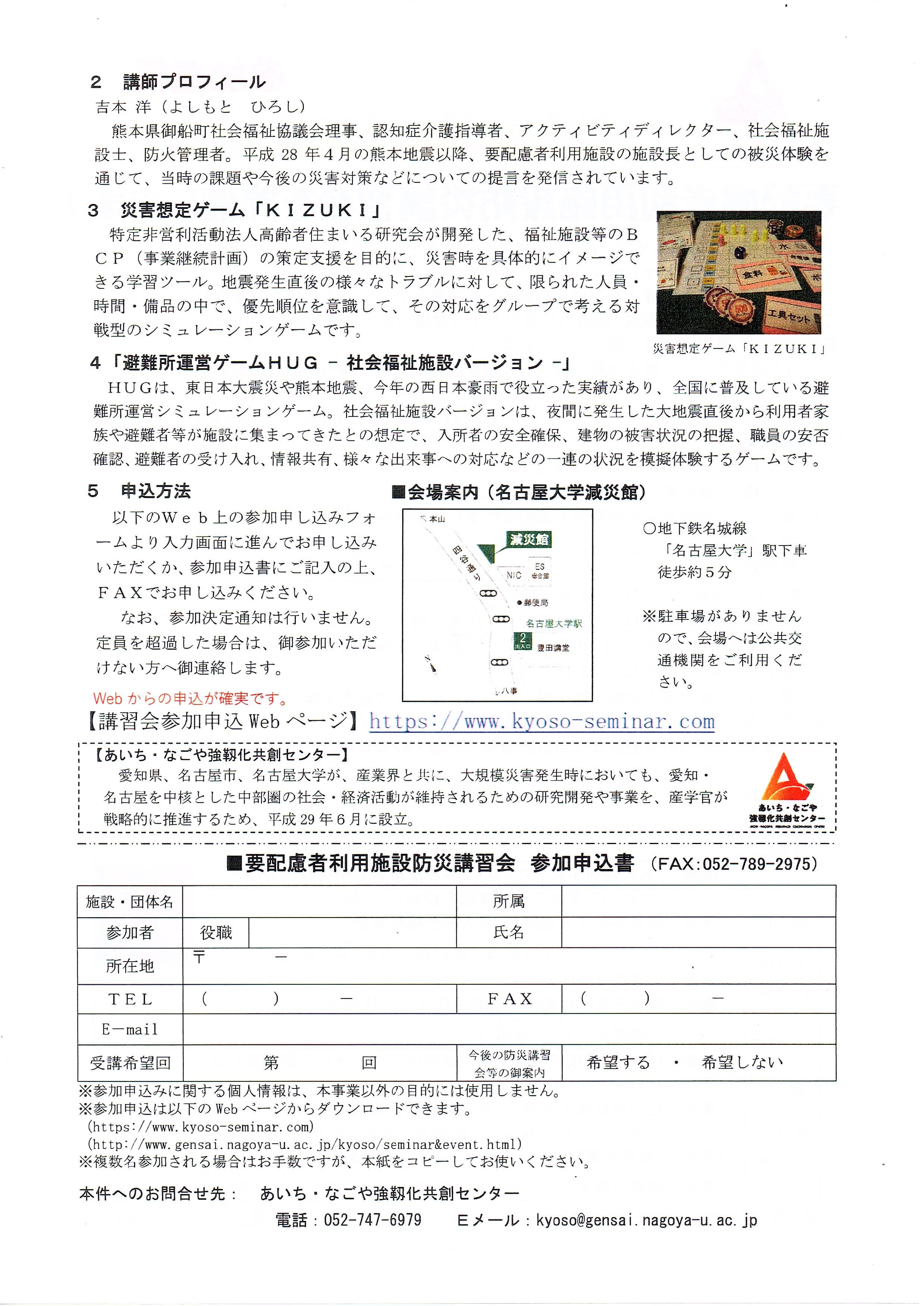 熊本地震での要配慮者利用施設の被災体験と「災害想定ゲームKIZUKI」「HUG社会福祉施設バージョン」等を活用した演習で各福祉施設の防災力向上及びBCPの策定等へ結び付けるあいち・なごや強靭化共創センターとの講習会について。新たな取り組み「これがKIZUKI化」(保育施設・特別支援学校等)の発表。