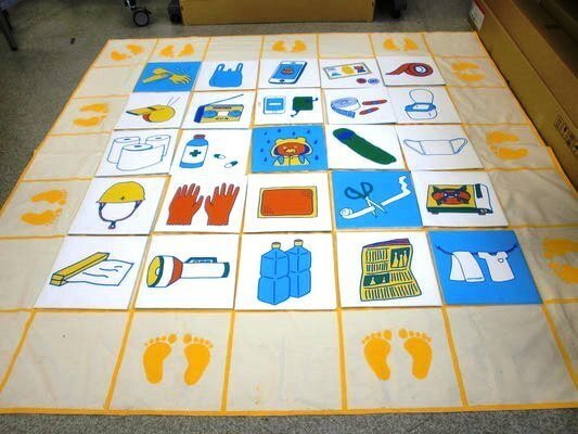 床に敷くジョイントマット(約180×180cm)をベースに災害時に必要な備品名を配置。