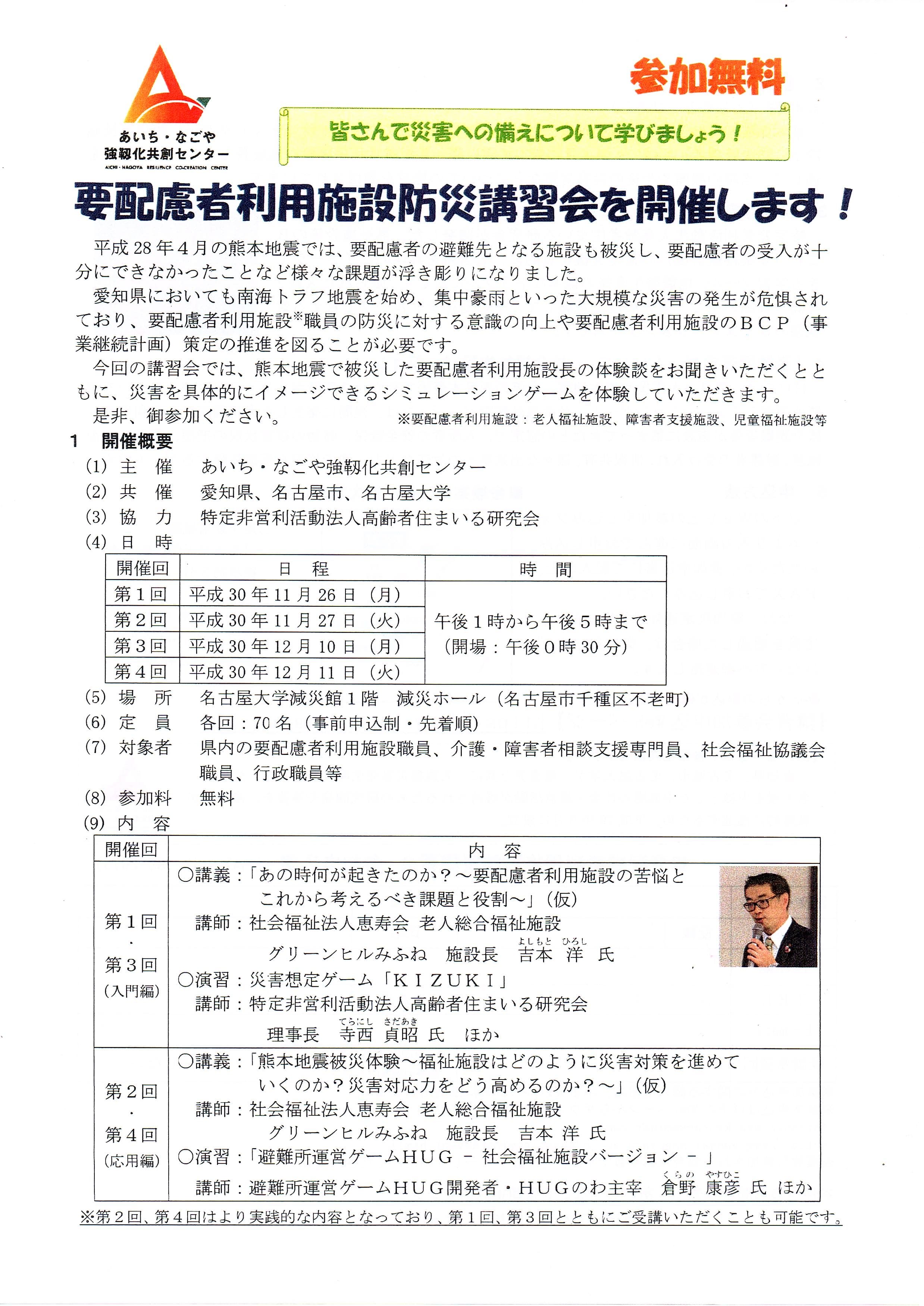 熊本地震での要配慮者利用施設の被災体験と「災害想定ゲームKIZUKI」「HUG社会福祉施設バージョン」等を活用した演習で各福祉施設の防災力向上及びBCPの策定等へ結び付けるあいち・なごや強靭化共創センターとの講習会について。新たな取り組み「これがKIZUKI化」(保育施設・特別支援学校等)の発表。