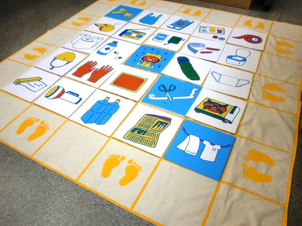 床に敷くジョイントマット(約180×180cm)をベースに災害時に必要な備品名を配置。
